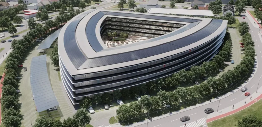 Arhitektonski koncept predviđa četiri povezane lamele koje okružuju atrij s uređenim zelenim površinama, čime se želi stvoriti moderan i funkcionalan poslovni prostor.