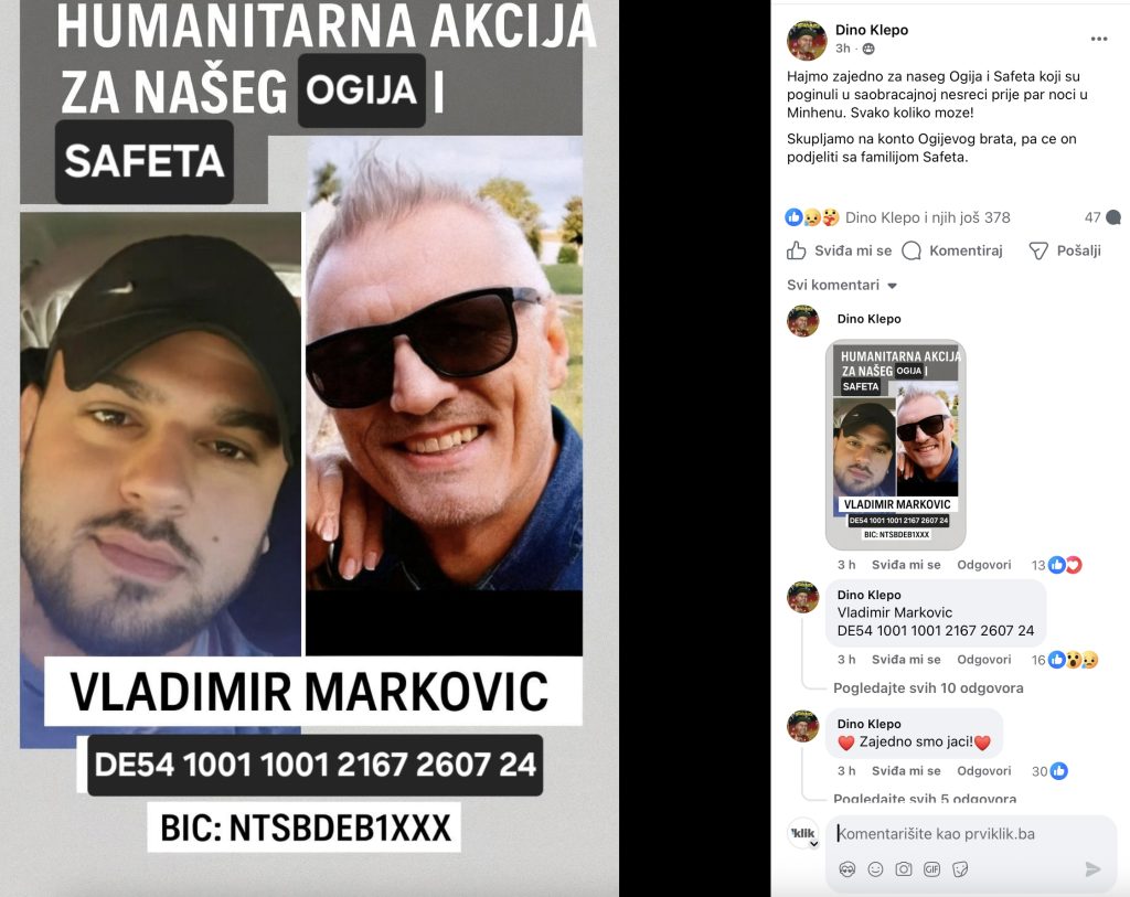 U jednoj od najvećih balkanskih online zajednica u dijaspori – Facebook grupi “Dino Gastarbajter” koja broji više od 200.000 članova – pokrenut je snažan humanitarni apel za pomoć obiteljima dvojice mladića koji su tragično poginuli u nedavnoj prometnoj nesreći u Münchenu.