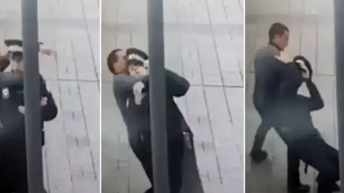 Policajac je vidno iznenađen, gubi ravnotežu i pokušava da se izvuče iz snažnog stiska, dok drugi prolaznici u šoku posmatraju situaciju.