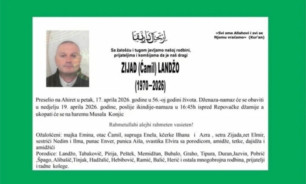 Dženaza rahmetli zijadu biti će klanjana u nedjelju, 19. aprila, poslije ikindija namaza u 16:45h ispred Repovačke džamije a ukop će se obaviti na haremu “Musala” Konjic.