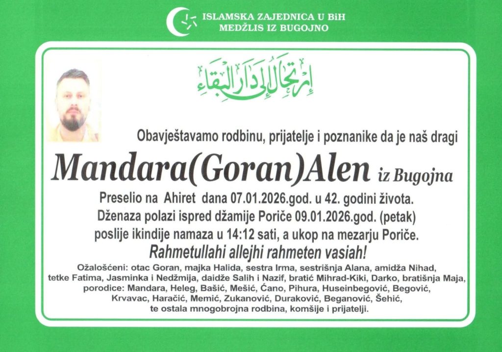 Dženaza-namaz će se klanjati u petak, 09.01.2026. godine, ispred džamije Poriče, poslije ikindije-namaza u 14:12 sati, a ukop će se obaviti na mezarju Poriče.