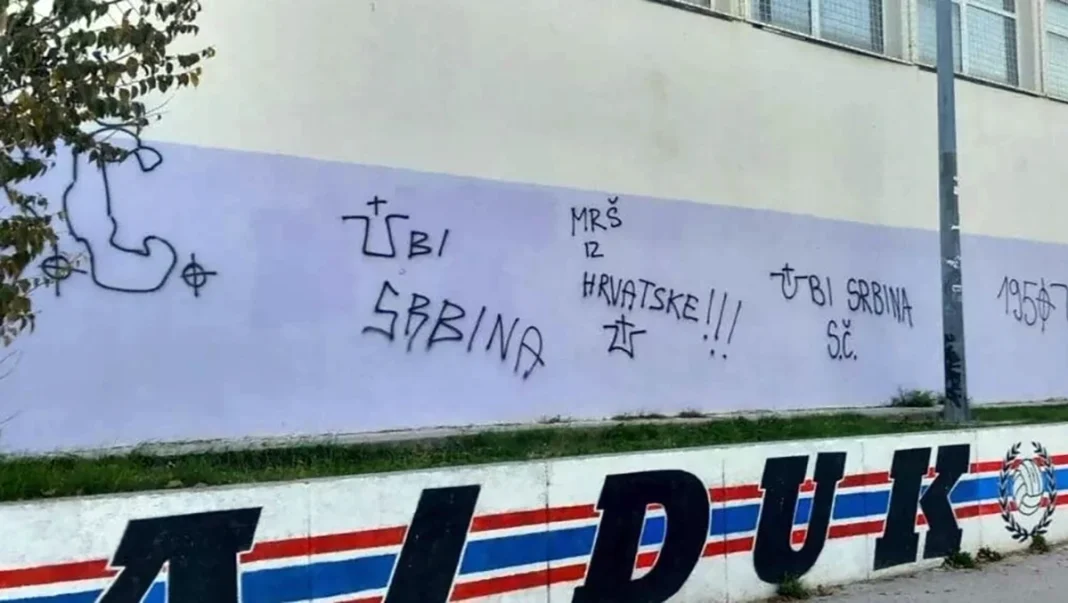 Na zgradi školske dvorane u splitskom naselju Plokite jutros su osvanuli grafiti s porukama mržnje upućenima prema Srbima. Na zidu su ispisane poruke poput “Ubij Srbina” i “Mrš iz Hrvatske”, uz ustaško slovo “U”, simbol koji se povezuje s ekstremnim nacionalizmom i ustaškim režimom iz Drugog svjetskog rata.